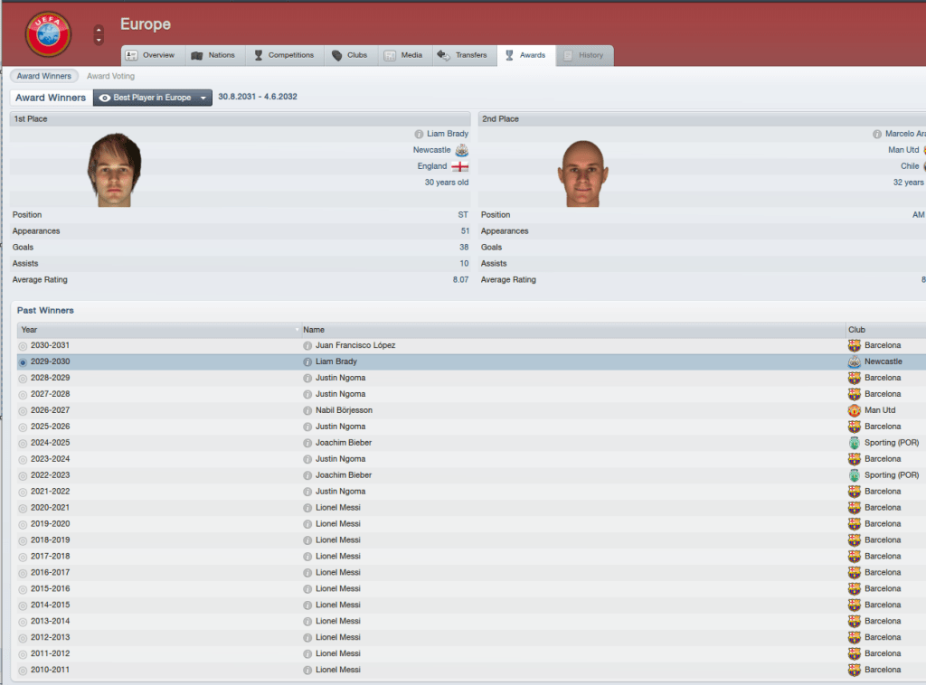For Brady, a good showing in the 2030 World Cup for England (getting the siver boot) and in Europe would mean he would be voted European Footballer of the year for 2030.